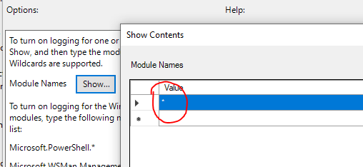 In the Module Names window, enter * to record all modules. Module logging events are written to Event ID (EID) 4103.